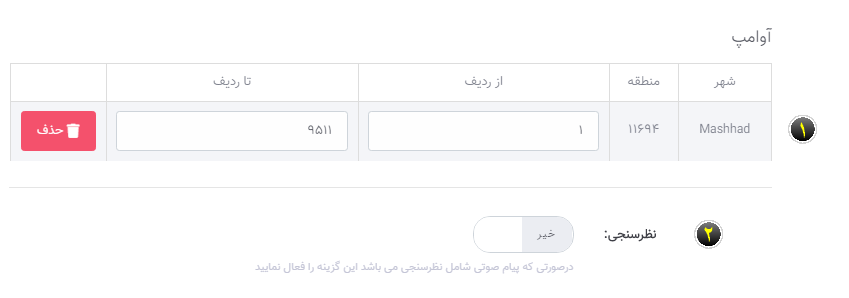 1. در این قسمت ، مناطقی را که انتخاب نموده اید نمایش میدهد . شما میتوانید با استفاده از گزینه از ردیف / تا ردیف تعیین نمایید برای چه تعدادی مخاطب از این منطقه ارسال انجام شود و یا حتی میتوانید بعضی از مناطق خود را حذف نمایید