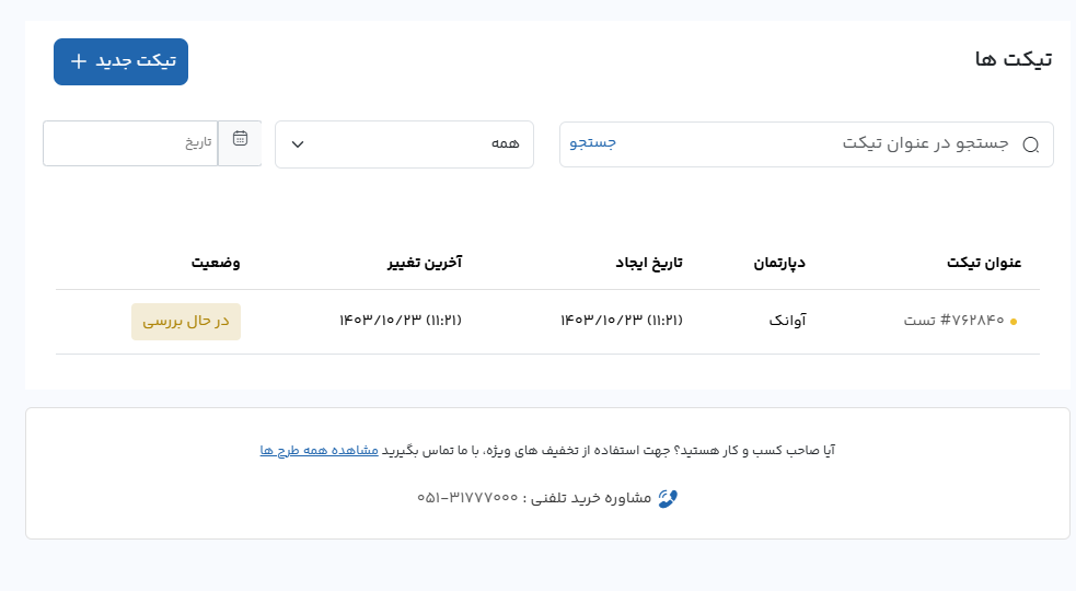 نکته : پس از بررسی تیکت توسط پشتیبانی، پاسخ مربوطه در ادامه همان تیکت ثبت خواهد شد. برای دریافت پاسخ، لطفاً به پنل کاربری خود مراجعه کرده و در بخش «پشتیبانی»، سپس «لیست تیکتها»، پاسخ تیکت خود را بررسی نمایید.
