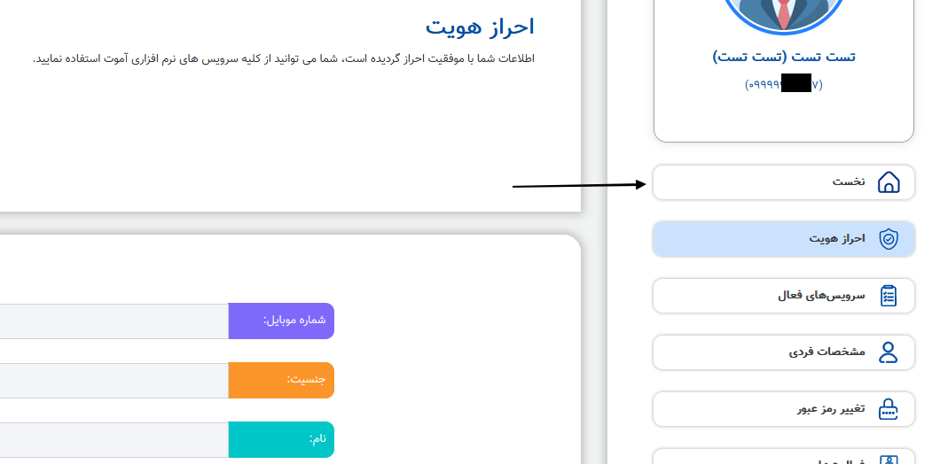 در این مرحله ثبت نام ما در سامانه آوانک انجام شده است ، اما جهت اینکه مجوز ارسال پیام را داشته باشیم ، باید احراز هویت انجام دهیم . از طریق گزینه اطلاعات کاربری باید وارد صفحه آموت اکانت شویم .