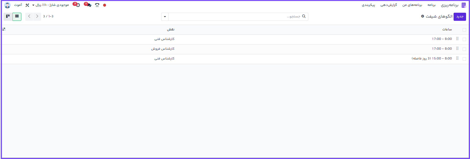 الگوهای شیفت: از طریق منوی پیکربندی ◄ الگوهای شیفت، میتوانید شیفتهای از پیش آمادهای را تعریف کنید (مثلاً «شیفت صبح: ۰۹:۰۰ تا ۱۷:۰۰»). این کار فرآیند ایجاد برنامههای هفتگی یا ماهانه را بسیار سریعتر میکند.