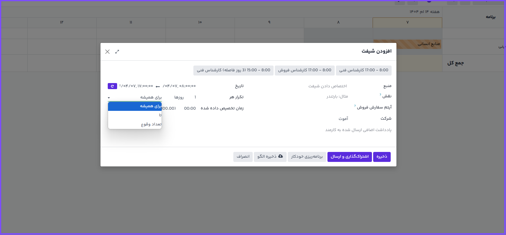 برای موقعیتهایی که یک برنامه کاری به صورت منظم تکرار میشود (مانند جلسات هفتگی یا شیفتهای ثابت)، میتوانید از ویژگی شیفتهای تکرارشونده استفاده کنید.