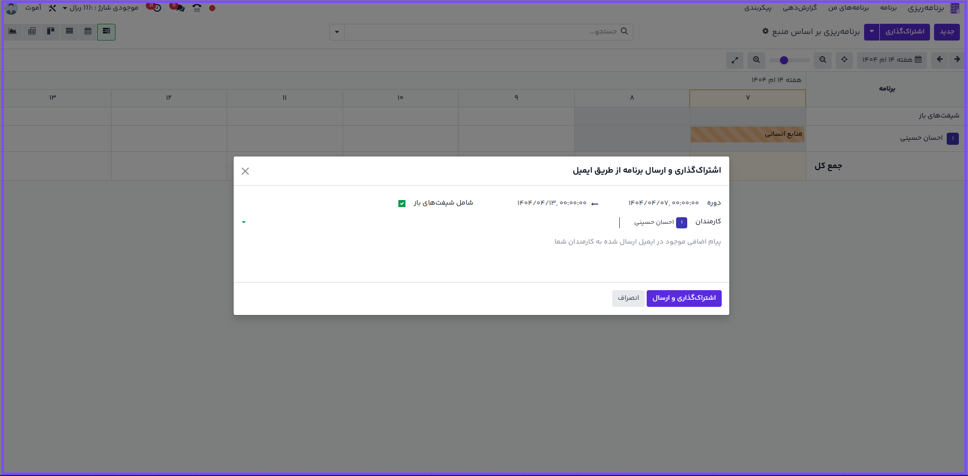 با زدن دکمه ارسال، ایمیلی حاوی برنامه کاری برای هر کارمند فرستاده میشود.