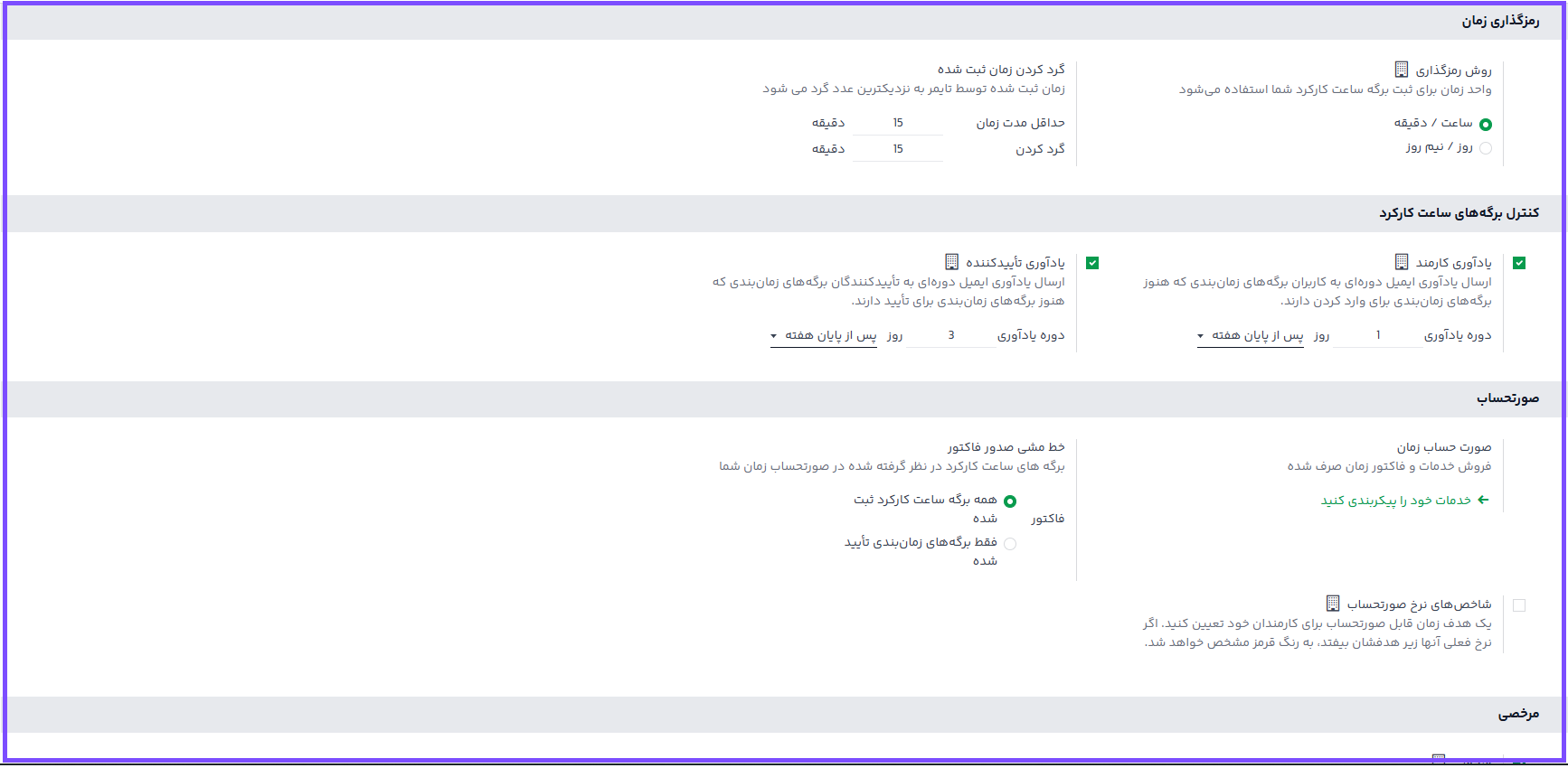 یادآوری به کارمندان: میتوانید یادآورهای خودکار (روزانه یا هفتگی) برای کارمندانی که فراموش کردهاند برگه ساعت کارکرد خود را پر کنند، تنظیم نمایید.