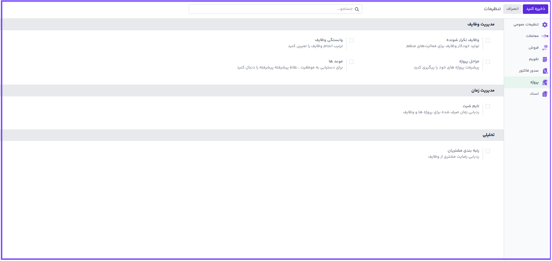 برای فعالسازی برگه ساعت کارکرد، ابتدا برنامه پروژه را باز کرده و به منوی پیکربندی ◄ تنظیمات بروید. در بخش مدیریت زمان، گزینه تایم شیت را فعال کنید.