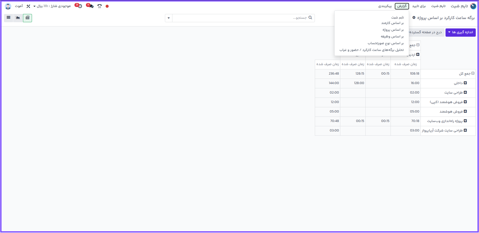 گزارش بر اساس پروژه: کل زمان صرفشده برای هر پروژه را مشاهده و با ساعات تخصیصدادهشده مقایسه کنید.