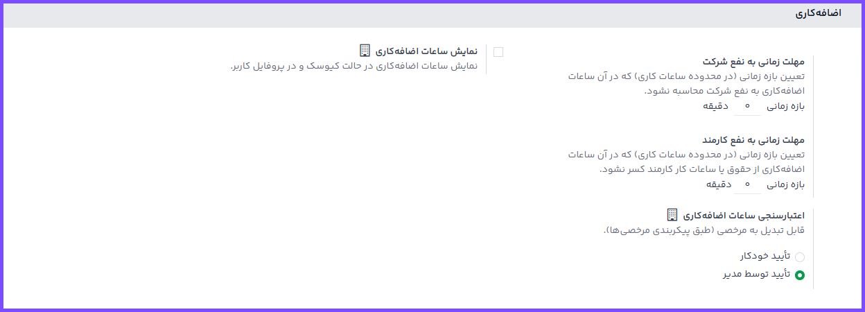 این گزینه برای مدیریت دقیق اضافهکاریها طراحی شده است تا از ثبت اضافهکاریهای ناچیز و غیرواقعی به نفع شرکت جلوگیری کند.