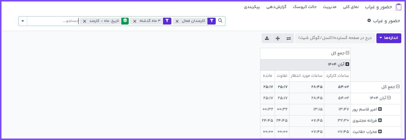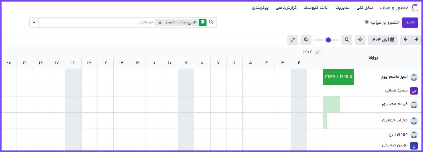 این ماژول بهطور پیشفرض با سیستمهای حقوق و دستمزد، مرخصیها، کارمندان و برنامهریزی شیفت یکپارچه است.