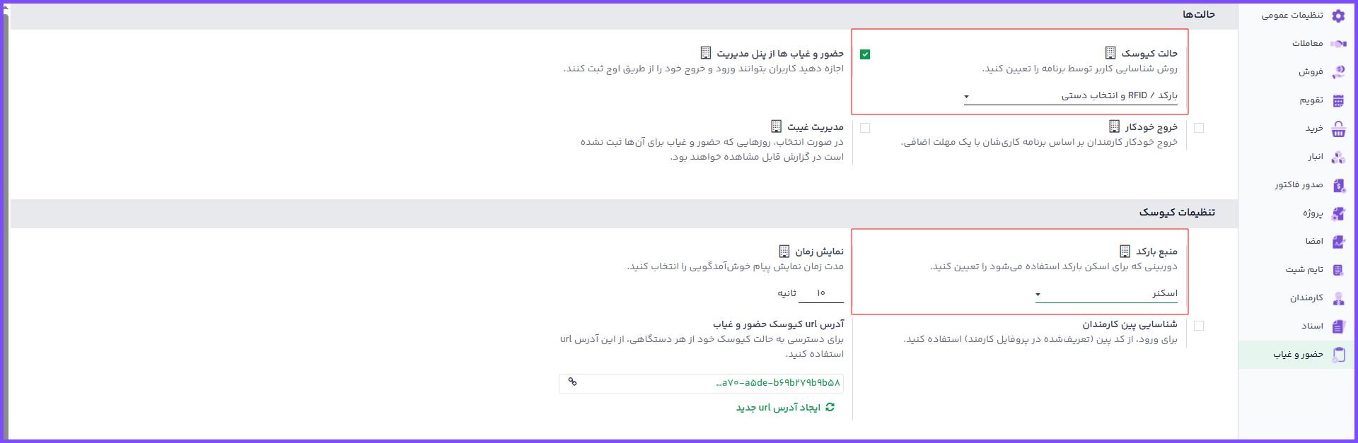 تنظیمات کیوسک → پیکربندی → حضور و غیاب
