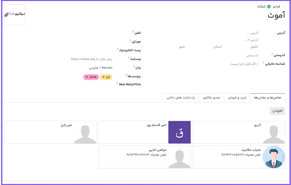 مخاطبان فردی میتوانند یک مخاطب شرکتی لینک شده داشته باشند. پس از انتخاب گزینه فرد، فیلد جدیدی با عنوان نام شرکت... زیر فیلد نام ظاهر میشود.