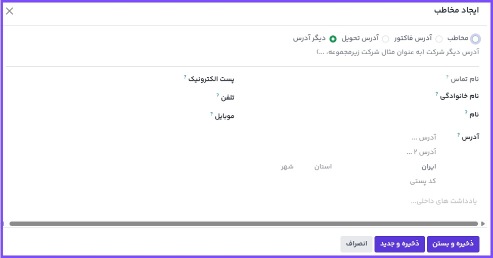 در فرم پاپآپ ایجاد مخاطب، انواع آدرسها به شکل دکمههای رادیویی در بالا قابل مشاهده هستند.