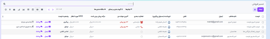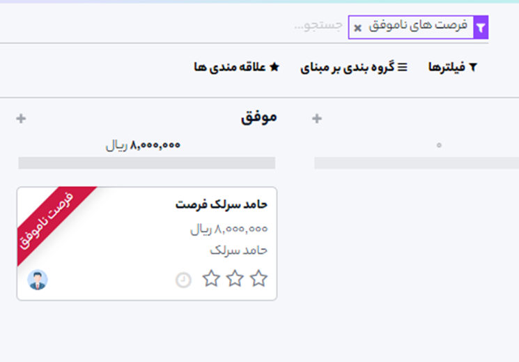 برای بازیابی فرصتهای از دست رفته و اجرای عملیات بر روی آنها (ارسال ایمیل، تماس جهت دریافت بازخورد و غیره)، در نوار جستجوی داشبورد فرصتها فیلتر باخته را انتخاب کنید.
