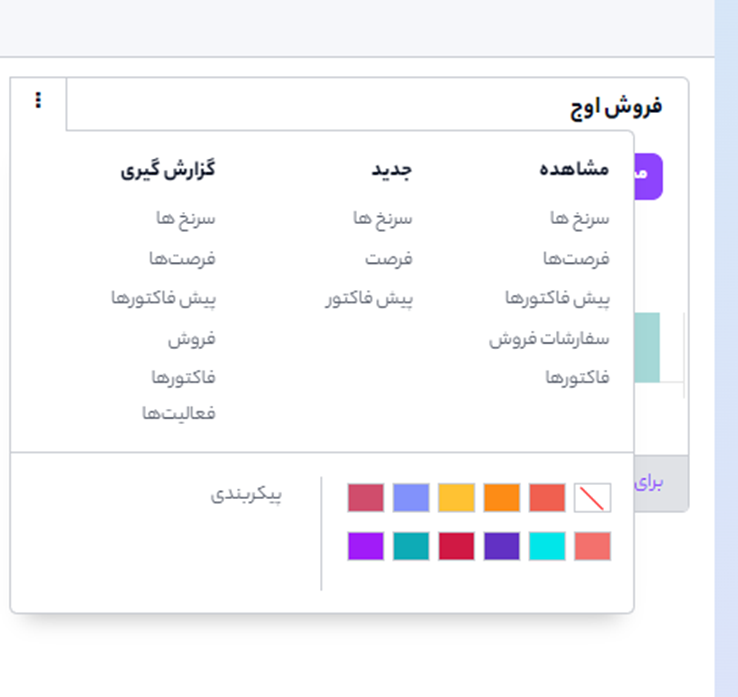 برای مشاهده منوی راهنما در گوشه کاشی بر روی سه نقطه کلیک کنید. در این منو نمایی سریع از اسناد یا گزارشها نمایش داده شده و امکان ایجاد پیشفاکتورها یا فرصتهای جدید، انتخاب رنگ برای تیم، و یا دسترسی به برگه پیکربندی تیم در آن تعبیه شده است.