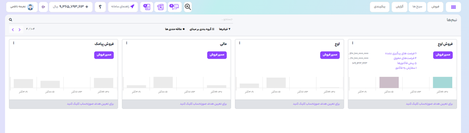 برای مشاهده داشبورد تیم فروش به منوی مدیریت ارتباط با مشتریان (CRM) ◄ فروش ◄ تیمها وارد شوید. در این داشبورد هر کاربر میتواند تیمهایی که عضو آن است را به شکل کاشیوار مشاهده کند.