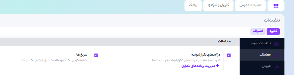 برای کار با این ویژگی وارد منوی مدیریت ارتباط با مشتریان (CRM) ◄ پیکربندی ◄ تنظیمات شده و در تب CRM ویژگی سرنخها را فعال نمایید.