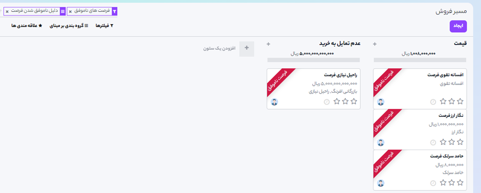 اگر میخواهید فرصتها را باز هم فیلتر کنید، میتوانید با افزودن فیلتر سفارشی برای دلیل باخت هم فیلتر اضافه کنید.
