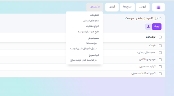در منوی مدیریت ارتباط با مشتریان (CRM) ◄ پیکربندی ◄ دلایل باخت میتوانید دلایل باخت تعریف شده را مشاهده کنید.