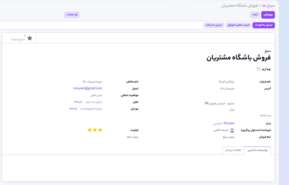 اگر از قبل با آن مشتری دارای یک فرصت بوده باشید، اوج ابری به صورت خودکار امکان ادغام با آن را توصیه میکند. همچنین، در این صفحه میتوانید به صورت خودکار این فرصت را به یکی از مشتریان قبلی (در صورت موجود بودن) پیوند دهید.