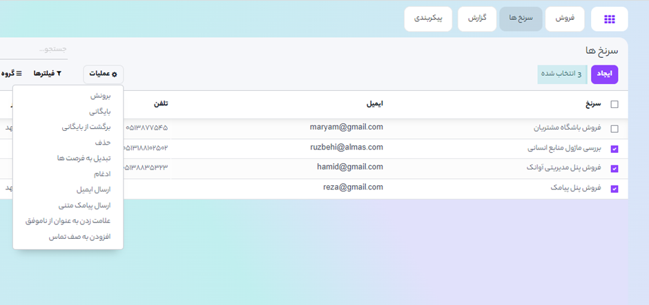 به این منظور، با استفاده از نمای لیست، فرصتها (یا سرنخهایی) که میخواهید ادغام شوند را انتخاب کنید. سپس با فعال شدن دکمه عمل میتوانید گزینه ادغام را انتخاب نمایید.