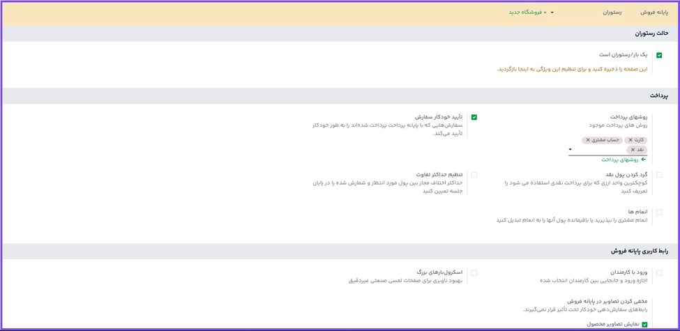 پس از اینکه پایانه فروش را از نوع رستوران یا کافیشاپ انتخاب میکنید، امکانات زیر در دسترس خواهند بود: