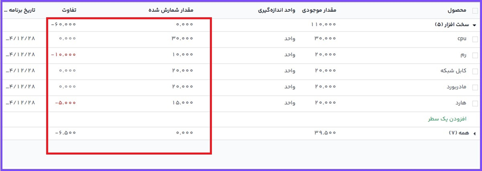 اگر تعداد شمارش شده بیشتر از تعداد موجود باشد، مقدار در ستون تفاوت با رنگ سبز نمایش داده میشود. اگر تعداد شمارش شده کمتر از تعداد موجود باشد، مقدار ستون تفاوت با رنگ قرمز نشان داده خواهد شد. اگر تعدادها مطابقت داشته باشند، و تغییری نداشته باشند، در ستون تفاوت مقداری نمایش داده نمیشود.