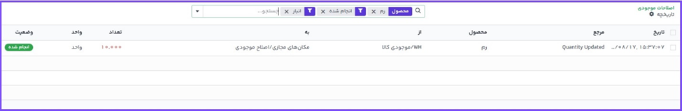 سپس، بعد از اعمال، یک انتقال با اختلاف بین تعداد موجود و تعداد شمارش شده در تاریخچه انبارگردانی محصول ثبت میشود.