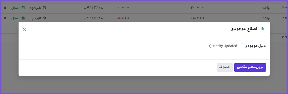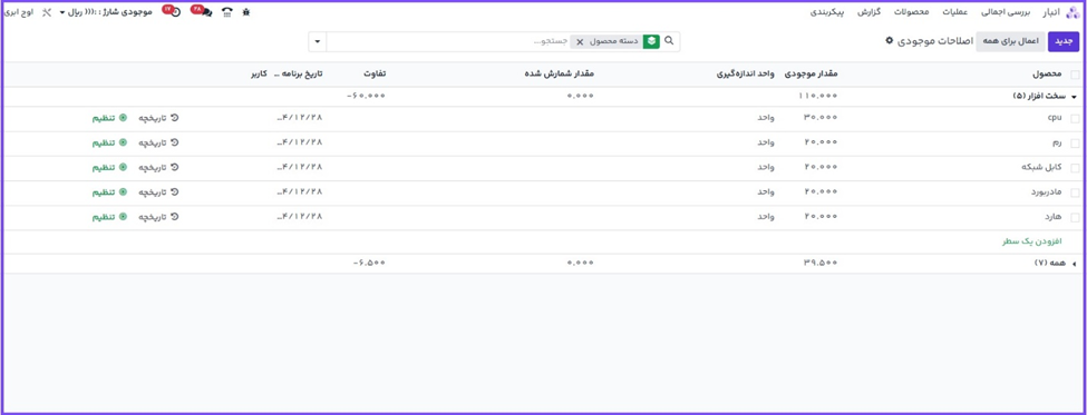 اگر مقدار شمارش شده جدید برای محصول با مقدار تعداد موجودی ثبت شده در پایگاه داده مطابقت ندارد، به جای کلیک بر روی دکمه تنظیم مقدار واقعی را در فیلد تعداد شمارش شده ثبت کنید.