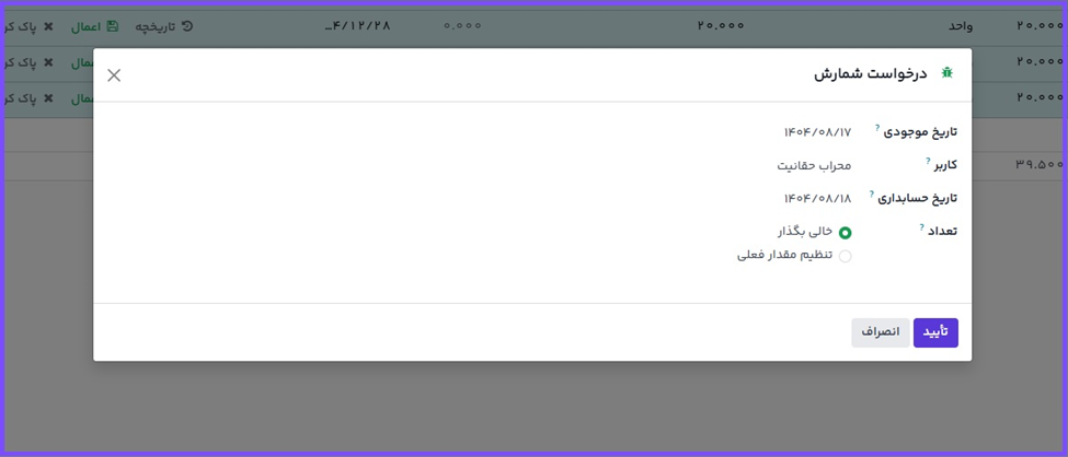 مقدار شمارش شده: تعداد واقعی شمارش شده در شمارش موجودی. این فیلد در حالت پیشفرض خالی است، ولی با توجه به اینکه آیا با تعداد موجودی مطابقت دارد یا نه، میتوان مقدار آن را تغییر داد.