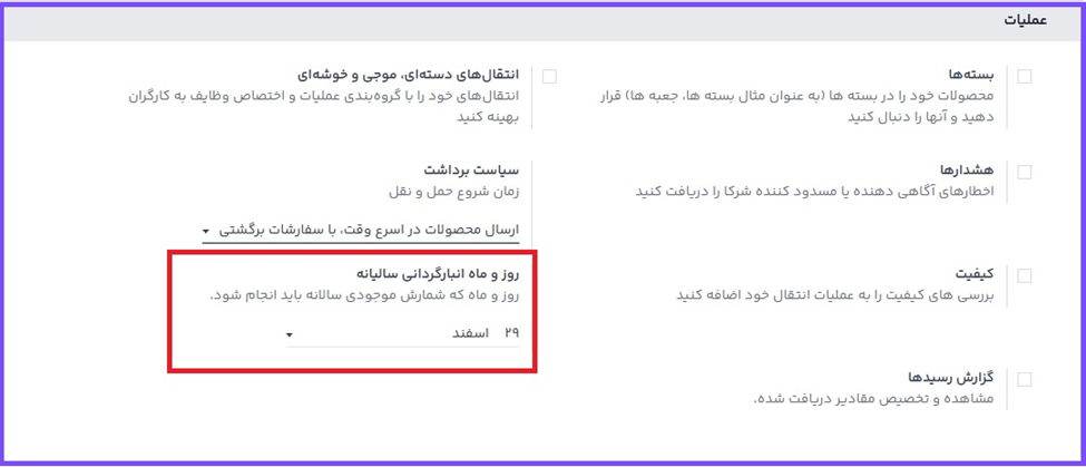 برای تغییر تاریخ زمانبندی شده پیشفرض وارد منوی برنامه انبار ◄ پیکربندی ◄ تنظیمات شوید. سپس در بخش عملیات گزینه روز و ماه انبارگردانی سالانه را پیدا کنید. این فیلد یک منوی کشویی است که مقدار پیشفرض آن 29 اسفند تعریف شده است.