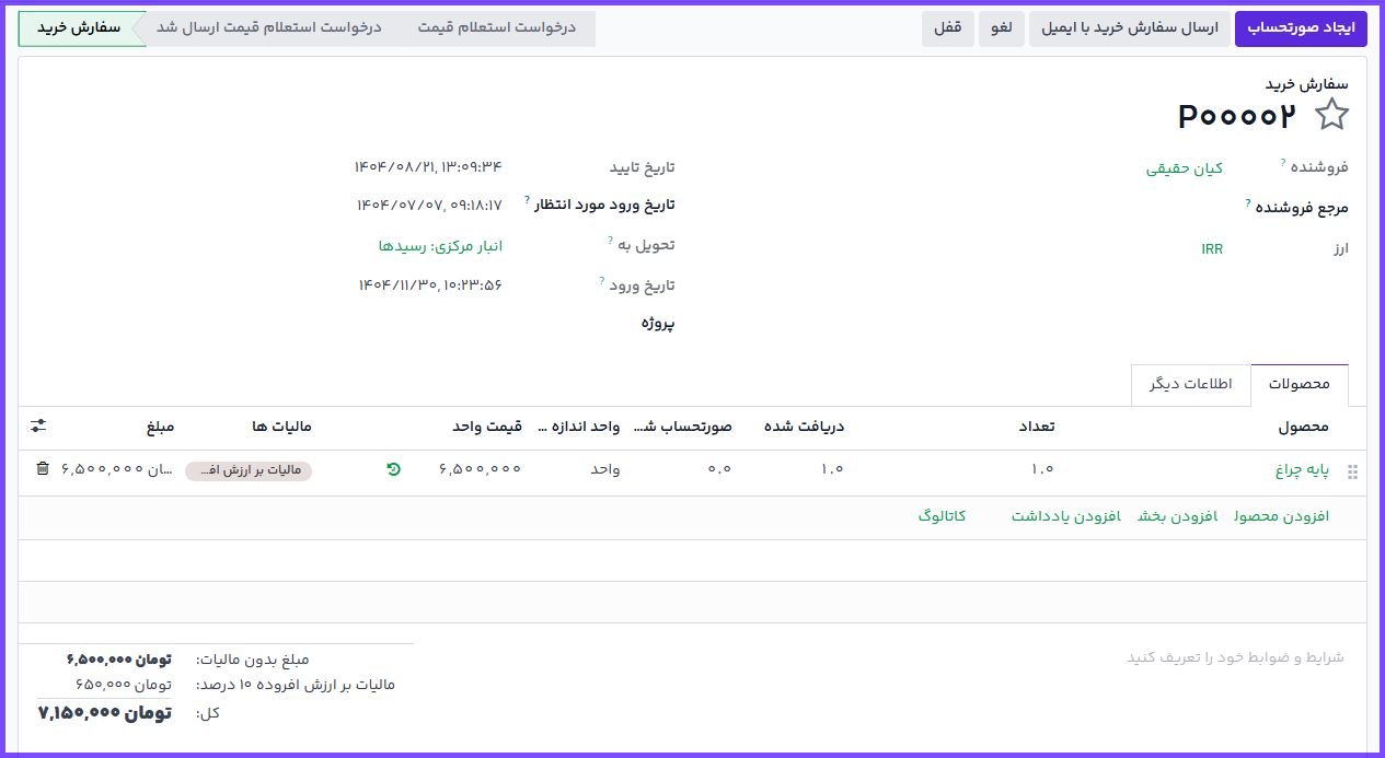 ابتدا وارد ماژول خرید شوید و از بخش سفارشهای خرید، سفارش موردنظر را باز کنید.