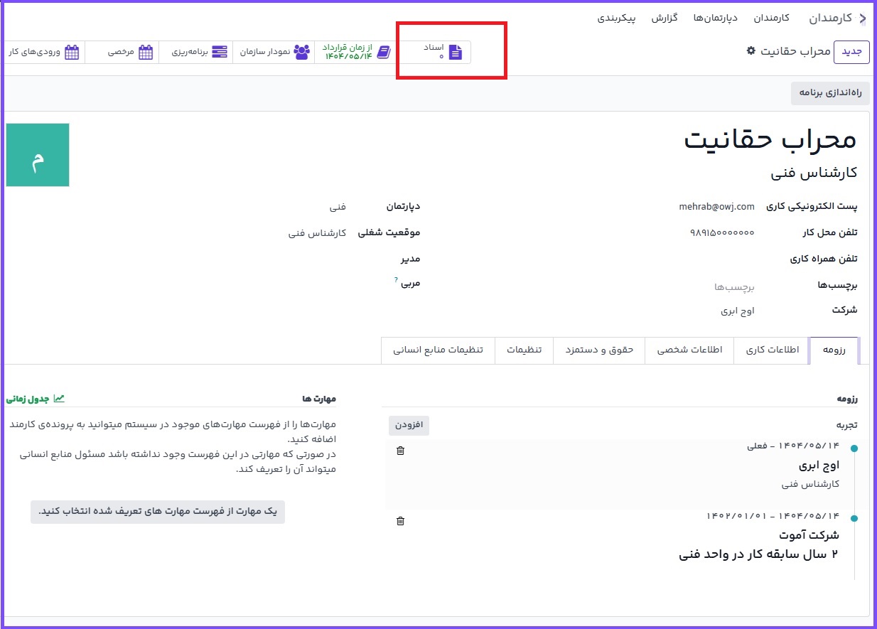 تمام اسناد مربوط به کارمند در برنامه اسناد ذخیره میشوند. تعداد اسناد مربوط به کارمند در دکمه هوشمند اسناد فرم کارمند درج شده است. برای مشاهده تمام اسناد این دکمه هوشمند را کلیک کنید. برای اطلاعات بیشتر درباره برنامه اسناد به راهنمای اسناد مراجعه کنید.