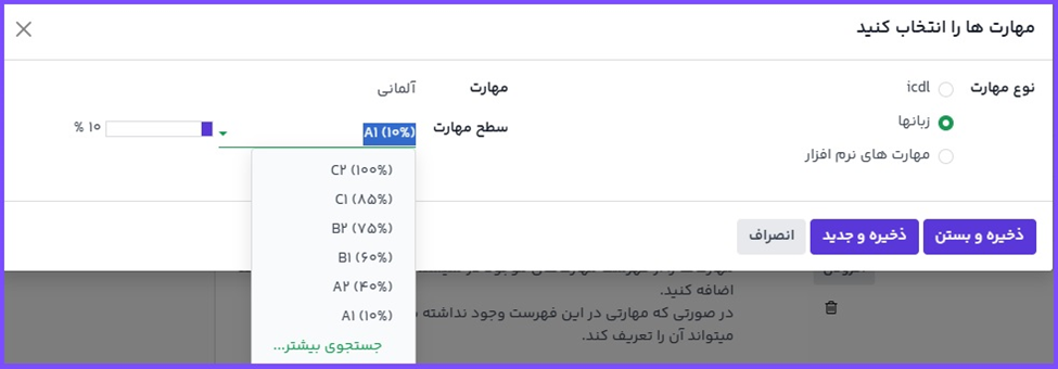 مهارت: بعد از انتخاب نوع مهارت، مهارتهای مربوطه قابل انتخاب میشوند. مثال، وقتی زبان را انتخاب میکنیم، برای فیلد مهارتخت زبانهای مختلف برای انتخاب نمایش داده میشود. مهارت مناسب را انتخاب کنید، یا مهارت جدیدی تایپ و روی ایجاد «(مهارت جدید)» کلیک کنید.