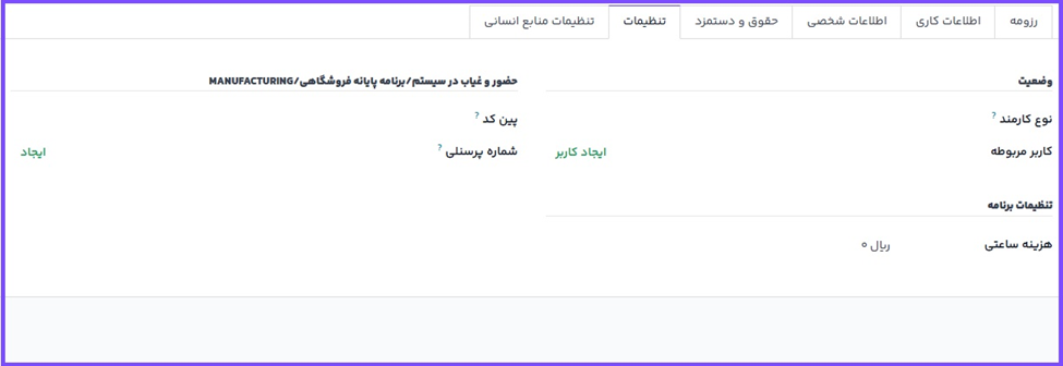 تنظیمات متقاضی: هزینه ساعتی کارمند را با فرمت XX.XX وارد کنید. این هزینه در مرکز کار محاسبه میشود. همچنین اگر ارزش محصول تولید شده ثابت نباشد، این مقدار در هزینه تولید محصول نیز دخیل میشود. این مقدار تأثیری در برنامه حقوق و دستمزد ندارد. در صورت وجود، شماره کارت تردد حملونقل را نیز وارد کنید.