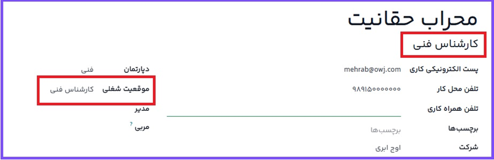 در فیلد موقعیت شغلی زیر نام کارمند میتوان اطلاعات دقیقتری اضافه کرد، از جمله «مشاور - آموزشی». این کار برای زمانی است که کارمند فقط بر روی مشاوره آموزشی تمرکز دارد.