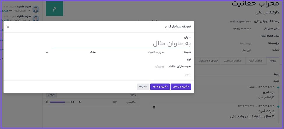 بعد از اینکه فرم کارمند جدید ذخیره شد، موقعیت شغلی و شرکت فعلی به صورت خودکار به تب رزومه اضافه میشوند و برای تاریخ پایان نیز عبارت در جریان درج میشود.