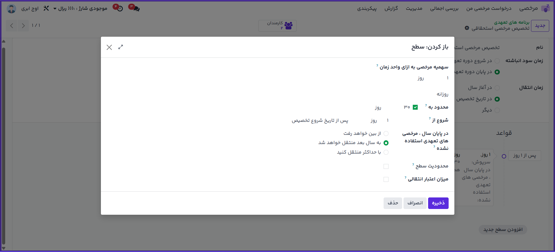سهمیه مرخصی به ازای واحد زمان : میزان مرخصی که در هر دوره به کارمند اضافه میشود (مثلاً 2 روز در ماه).