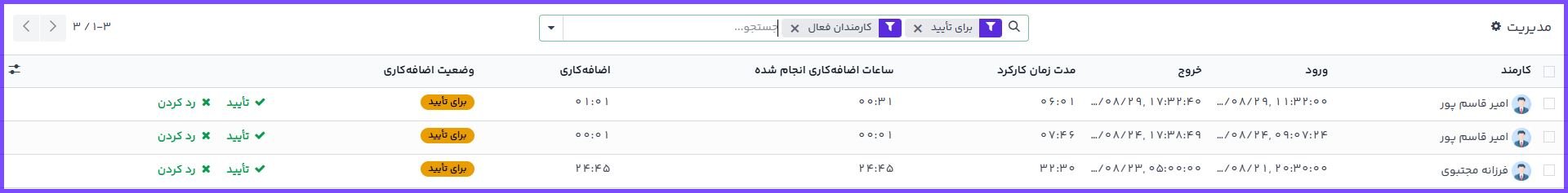 وضعیت اضافهکاری: معمولاً «برای تأیید» یا «تأیید شده»