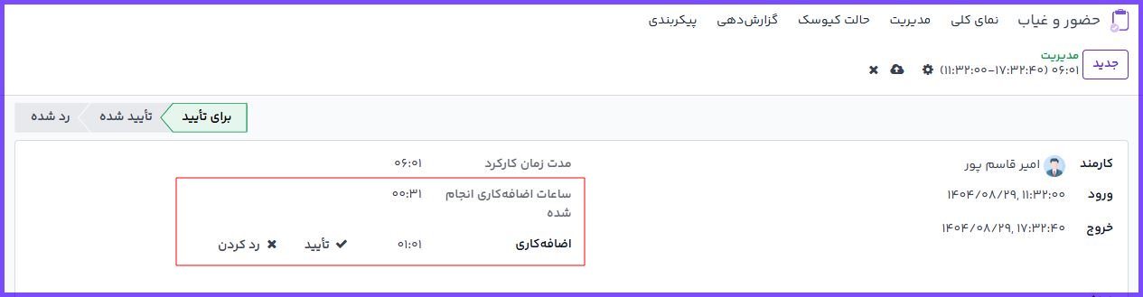 پس از اعمال تغییر، فیلد ساعات اضافهکاری انجام شده تفاوت میان کارکرد واقعی و ساعات تأییدشده را نشان میدهد.