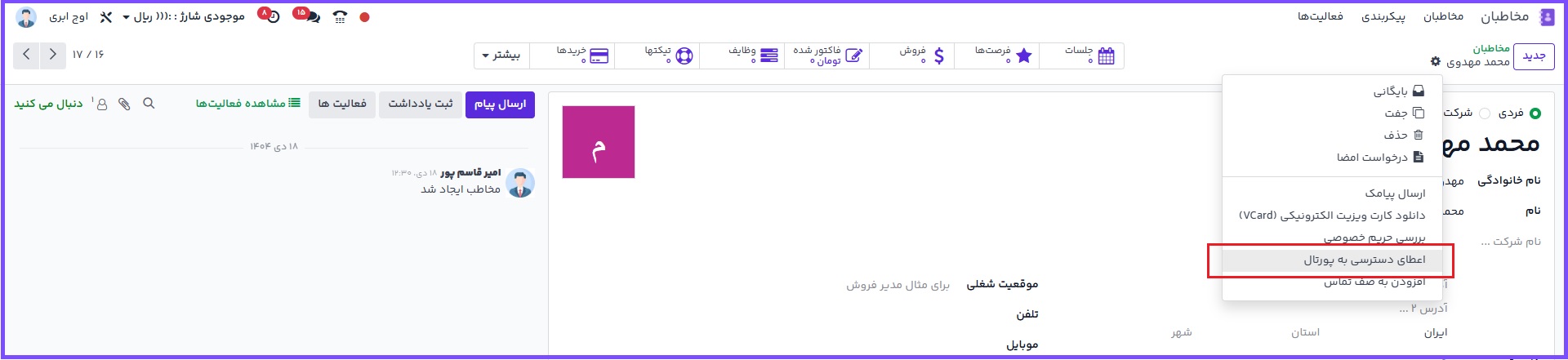 در فرم مخاطب میتوان با استفاده از کلید عملیات از قسمت بالایی فرم فعالسازی دسترسی پرتال را انجام دهید و امکان ورود این شخص به پرتال را فراهم کرد. پس از انجام این مرحله، دعوتنامهای از طریق ایمیل و پیامک برای مخاطب ارسال میشود تا رمز عبور خود را تنظیم کرده و وارد فضای پرتال شود.