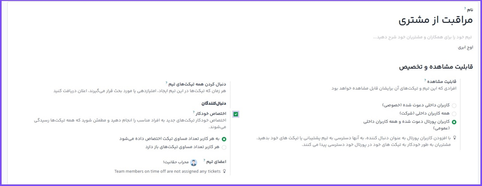 در بخش قابلیت مشاهده مشخص کنید چه کسی این تیم و تیکتهای مربوطه آن را مشاهده میکند.