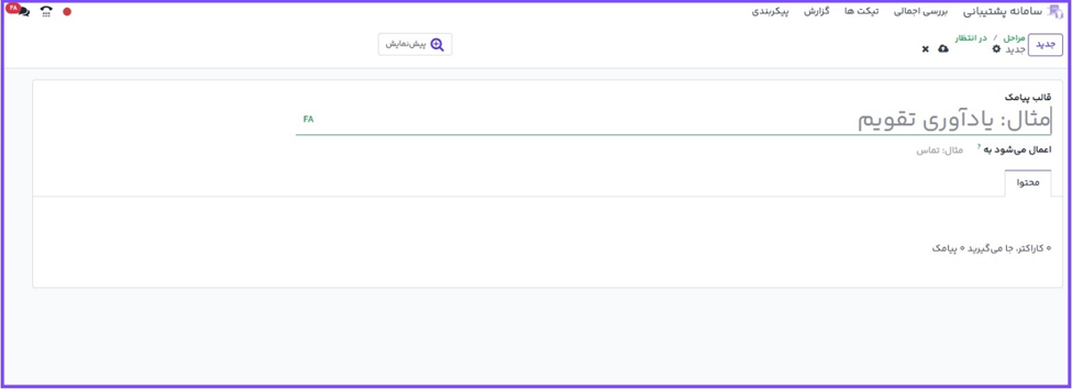 اگر برای مرحله قالب ایمیل اضافه شود، هرگاه تیکت در داشبورد سامانه پشتیبانی به آن مرحله رسید، به صورت خودکار ایمیلی به مشتری ارسال میشود. همچنین اضافه کردن قالب پیامک یک پیام کوتاه به مشتری ارسال میکند.