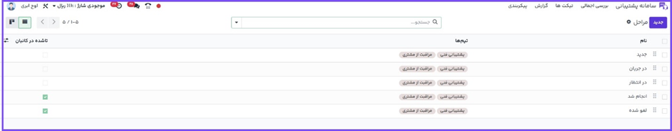در نمای لیست، تمام مراحل موجود در سامانه پشتیبانی نمایش داده میشوند. این لیست به ترتیب نمایش در داشبورد فرصتها مرتب شده است. برای تغییر ترتیب مراحل، از دکمههای فلش در کنار هر ردیف در لیست استفاده کنید.