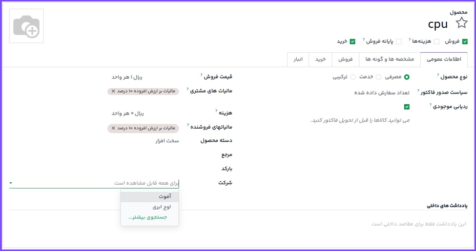 هنگامی که از حالت چند شرکتی استفاده میشود، میتوان دادههایی همچون محصولات، مخاطبان، و تجهیزات را بین شرکتها به اشتراک گذاشته و یا استفاده از آنها را فقط برای یک شرکت خاص محدود کرد. برای این کار، در فرمهای مربوطه (مثلِ یکی از محصولات)، گزینههای زیر را در اختیار خواهید داشت: