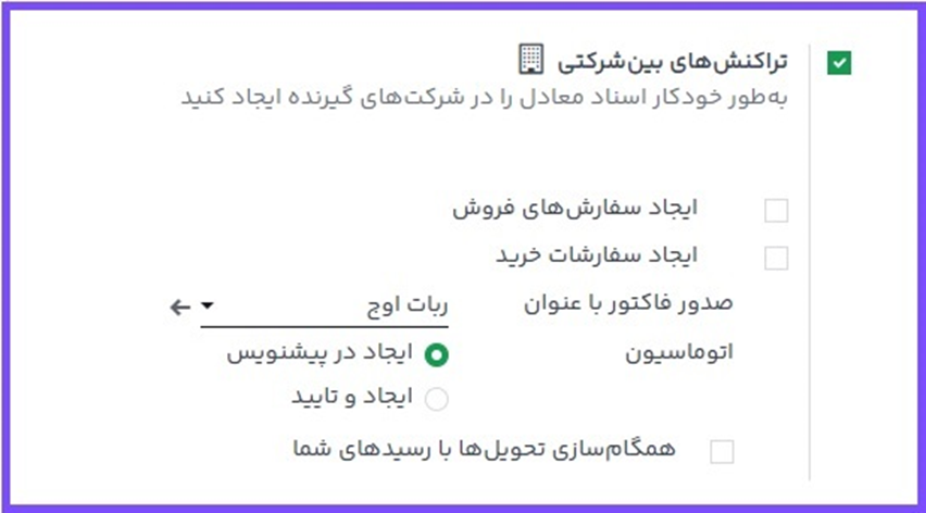 مثال: هرگاه فاکتوری در شرکت من (تهران) برای شرکت من (تبریز) ثبت میشود، به صورت خودکار یک صورتحساب فروشنده نیز از شرکت من (تهران) در شرکت من (تبریز) ایجاد میشود.