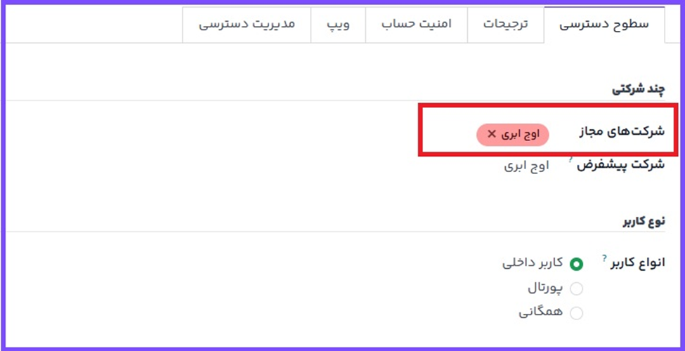 پس از ایجاد شدن شرکتها، میتوانید سطوح دسترسی کاربران به چند شرکت را مدیریت کنید.