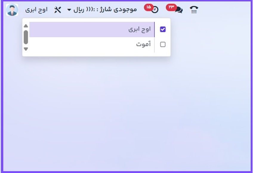 پس از تعریف و ایجاد شرکت، میتوانید به آسانی و با فعال کردن تیک هر شرکت بین آنها سوئیچ کنید. شرکتی که به رنگ بنفش روشن نمایش داده میشود، شرکتی است که هماکنون محیط آن در حال استفاده است. برای سوئیچ بین محیطها، تنها کافیست نام شرکت مورد نظر را کلیک کنید. در مثال زیر، کاربر به دو شرکت دسترسی دارد، دو شرکت فعال هستند، و محیط مورد استفاده نیز شرکت اوج ابری است.