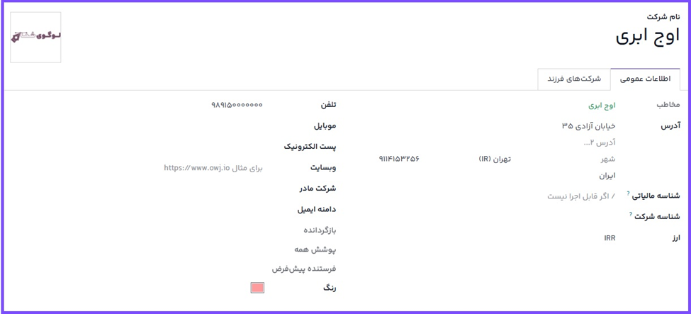 وارد منوی تنظیمات ◄تنظیمات عمومی ◄ شرکتها شوید، و دکمه جدید را بزنید. سپس، فرم را مطابق با اطلاعات شرکت تکمیل کنید. اگر در فیلد شرکت والد، شرکتی انتخاب شده باشد، رکوردها بین دو شرکت مشترک خواهند بود (البته اگر هر دو محیط فعال باشند).