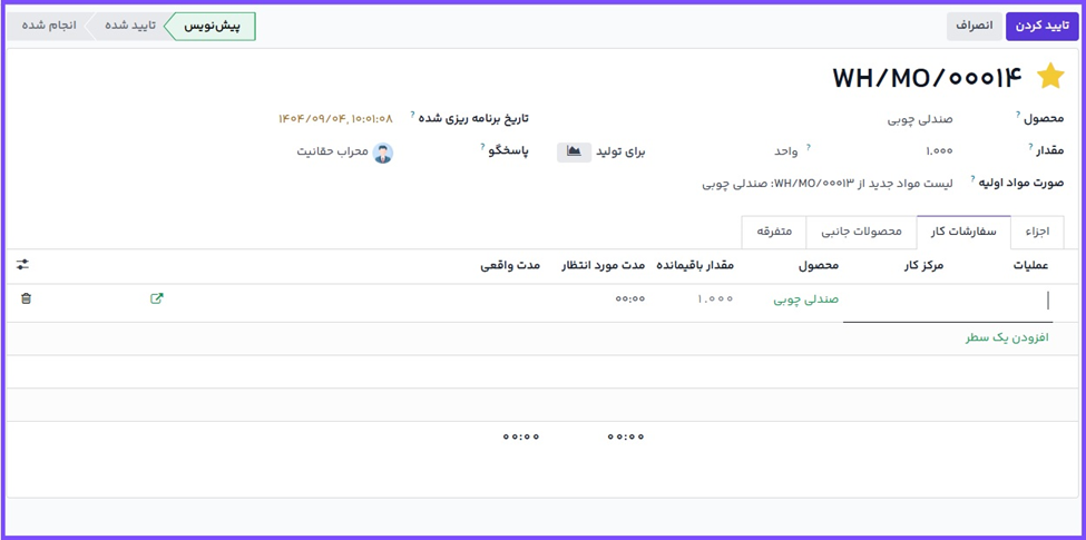 سپس یک صورت مواد اولیه جدید ایجاد کرده، وارد تب سفارشات کار شوید، و با کلیک بر افزودن سطر عملیات جدید تعریف کنید. در فرم ایجاد سفارشات کار، نام سفارشات کار، مرکز کار و مدت زمان آن را مشخص کنید. همچنین میتوانید گونه محصول خاصی را در فیلد اعمال بر گونهها تعیین کنید تا عملیات فقط برای همان گونه اعمال شود. در پایان ذخیره و بستن را بزنید.