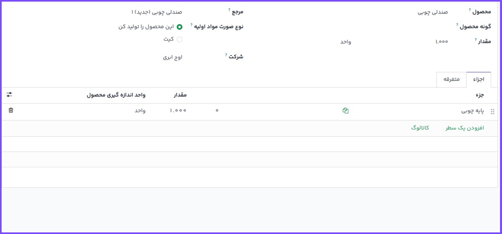 صورت مواد اولیه را همچنین میتوان به صورت مستقیم از فرم محصول نیز انتخاب کرد؛ در این حالت فیلد محصول از پیش پُر شده است.برای BoM استاندارد نوع BoM را در حالت «تولید محصول» قرار دهید. سپس برای تعیین اجزای مختلفی که محصول نهایی را تشکیل میدهند و همچنین تعداد آنها، از دکمه افزودن سطر استفاده کنید. اجزای جدید را میتوان مستقیماً از داخل صورت مواد اولیه ایجاد کرد، یا از قبل در مسیر تولید ◄ محصولات ◄ محصولات ◄ جدید تعریف کرد. برای نهاییسازی، دکمه ذخیره را بزنید.