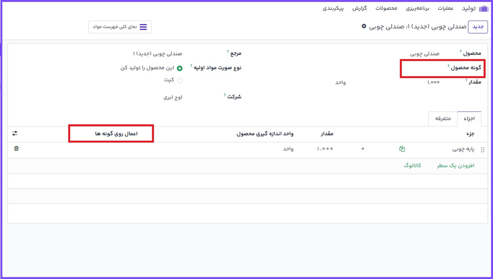 تنظیم صورت مواد اولیه (BoM) برای یک گونه محصول