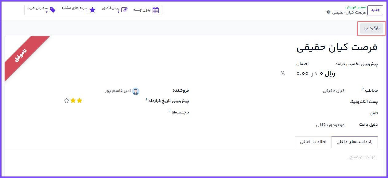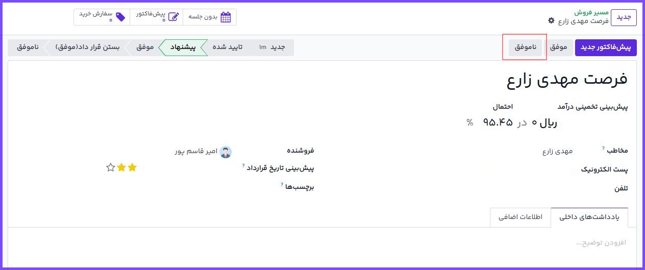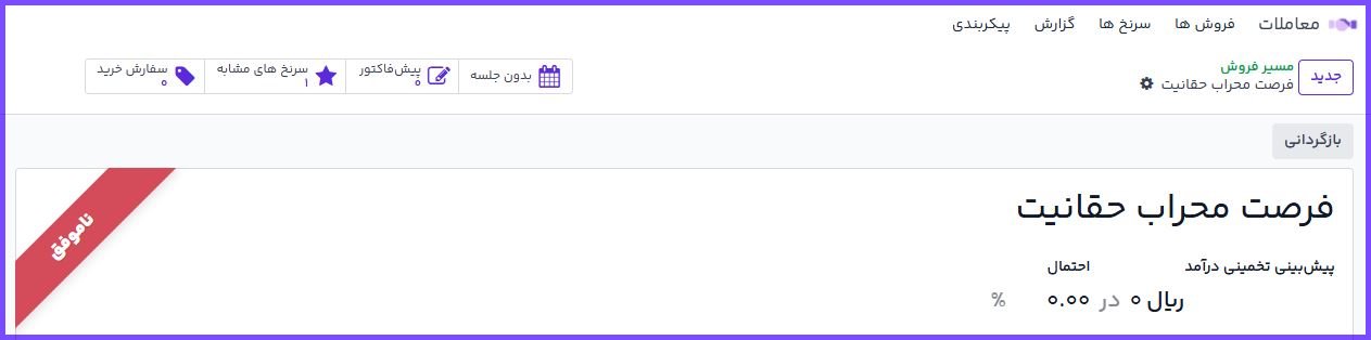 پس از ذخیره، برچسب قرمز ناموفق در بالای فرصت نمایش داده میشود.